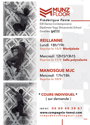 Cours de yoga/prana/relaxation le mardi de 12h15 à 13h15 Atelier chorégraphique, le mardi de 13h15 à 14h30 En savoir plus : https://www.legrenierducorps.com/ "Questionner son identité de danseur, d’interprète et de chorégraphe" Cet atelier est ouvert à toutes personnes qui souhaitent intégrer et s'engager dans des projets de création. Nous traversons ensemble des processus de recherche chorégraphique nous appuyant sur des supports comme l'improvisation, l'interprétation, la composition instantanée, la danse "in situ", le croisement "danse-écriture"... Nous affinerons notre qualité de danseur(se) en travaillant sur des matières corporelles spécifiques (ancrage, présence, état, intention, respiration, espace, écoute, poids, rythme, musicalité, énergie...) L'atelier a depuis cinq ans présenté différents projets de créations dans différents contextes (rue, musée, festival, théâtre, in situ...) avec un travail spécifique autour de l'écriture et du cinéma. Trois courts-métrages ont vu le jour, le dernier, tourné cet été sur l'Etna, est en cours de montage. Cet Atelier de recherche chorégraphique est un espace ouvert et accueillant, bienvenue!